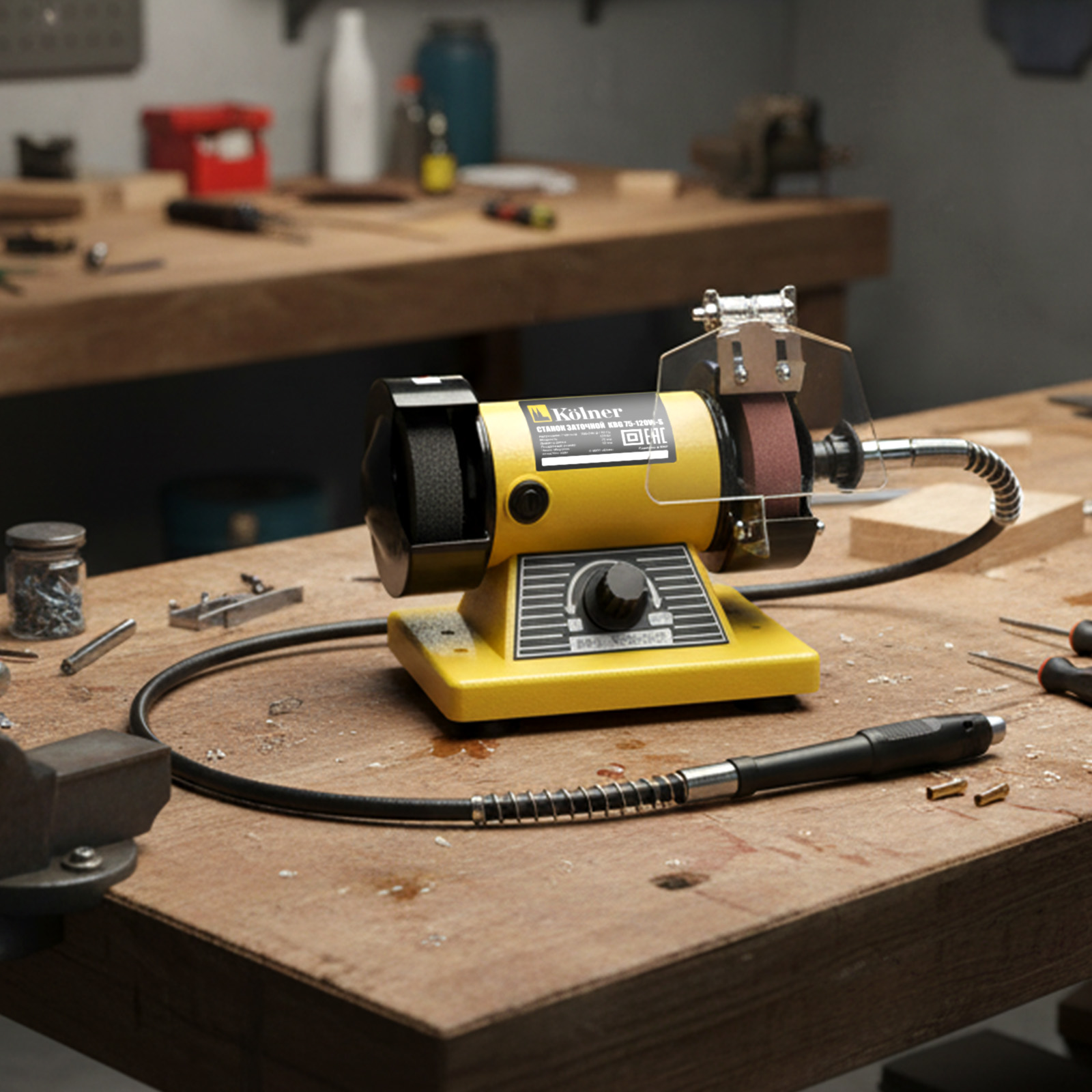 Комплектация: станок заточный, 2 круга (уже установлены), защитный экран с креплением (1 комплект), рабочая площадка с креплением (1 комплект), гибкий вал, цанга (2 шт.), ключ (2 шт.), руководство по эксплуатации.